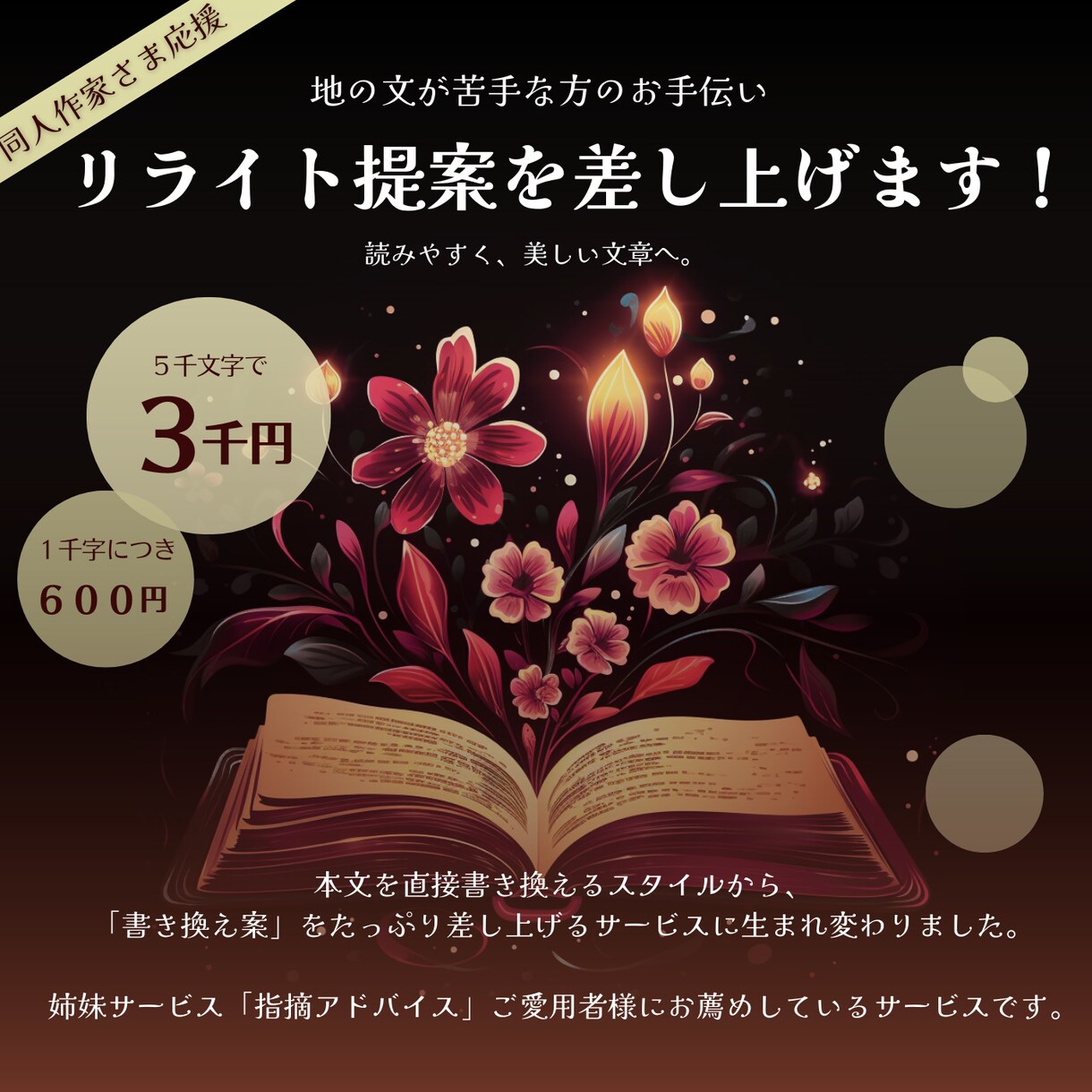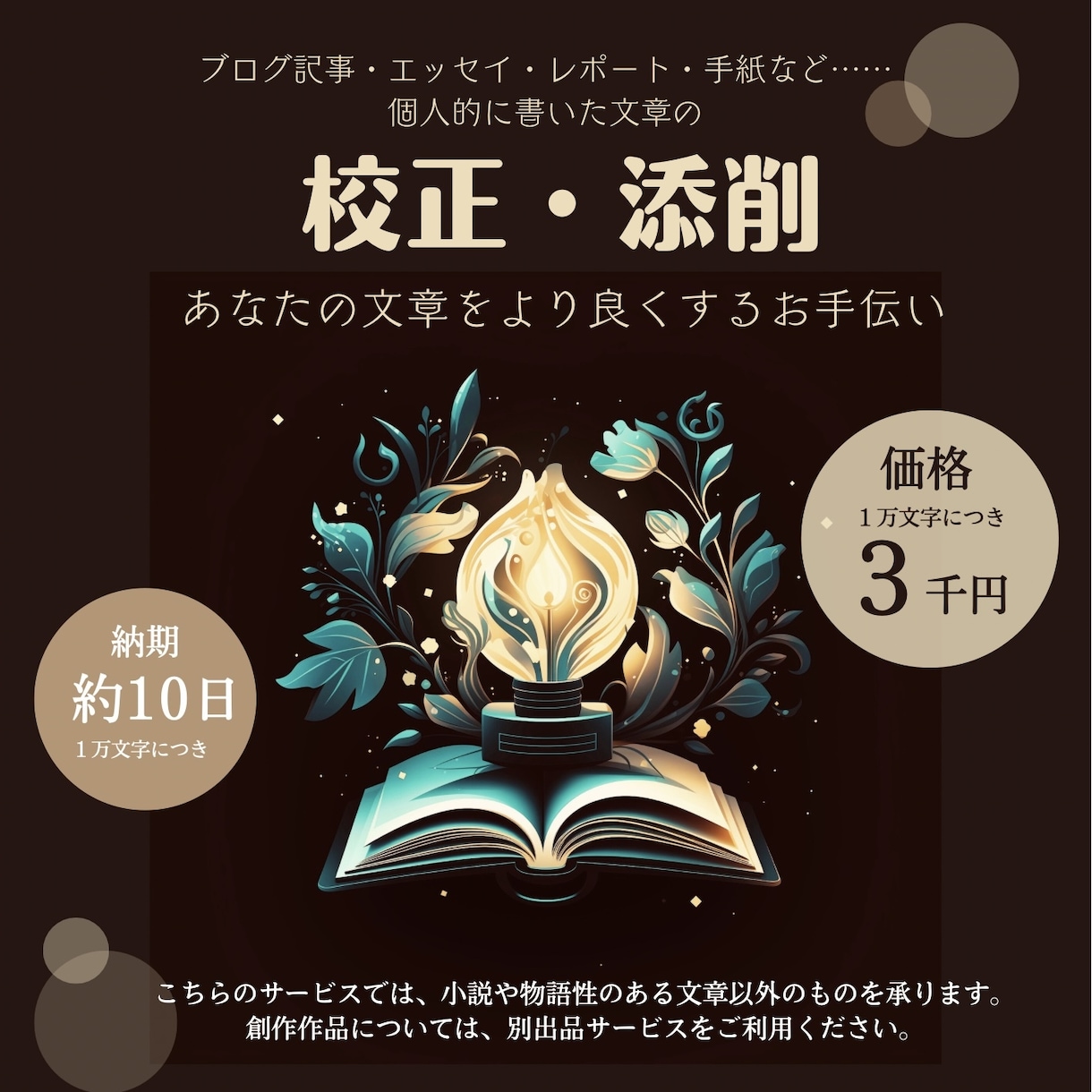 おそらく相場の価格からして考えられないほどのコスパの良さだと思っています。いくら低価格であっても決して手を抜かない、妥協しない、自分自身の作品と同じように作品に対して全力で向き合って深く深く推敲していきます。そして作者さまの不安や悩みに精一杯気持ちを傾け、寄り添うようなサービスにしたいと考えているので、終始全力で取り組んでいます。