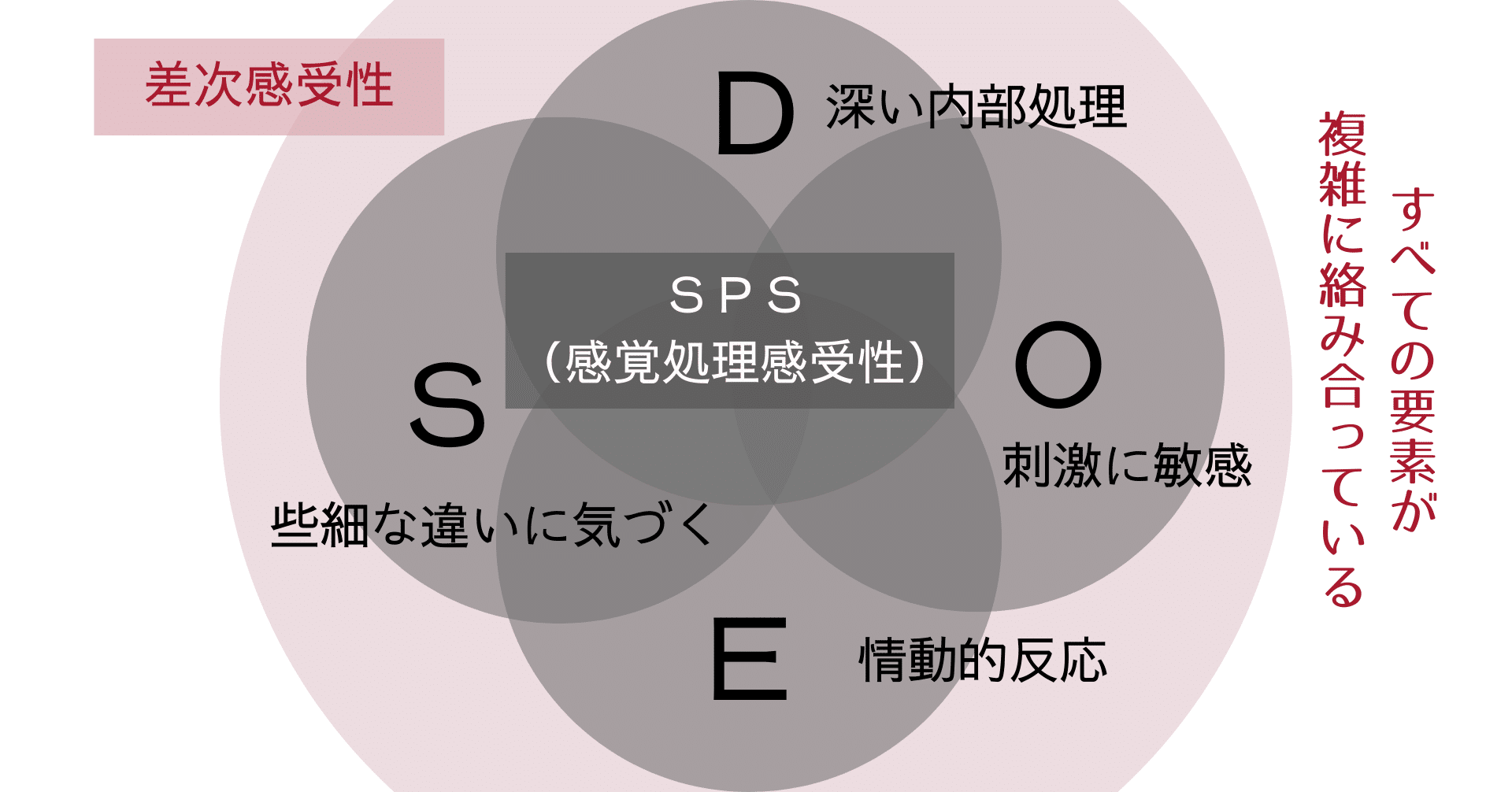「O」に進む前に、今回もまず一つだけ注意点を。SPS(感覚処理感受性)をわかりやすく理解するための基準「DOES」は、それぞれが複雑に絡み合い影響し合っています。今回の「O」も然り。このあと考える「E」や「S」と関係しているのですね。人間の心理構造はとても入り組んでいるからです。これらを別々のものと捉えるのでなく下の図のように受け止めておくとよいかもしれません。