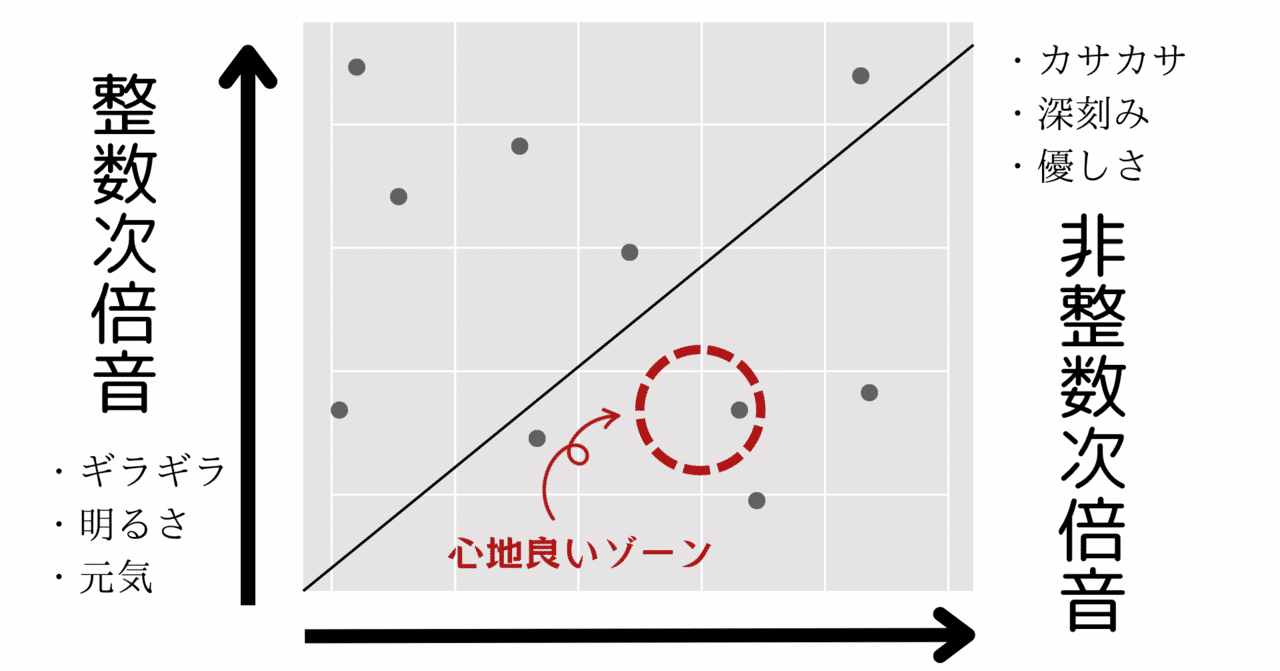 整数次倍音(=密度の高い安定した音)か、非整数次倍音(=空気を含んだ不安定な音)か、で分類できますが、例えばアーティストなどの歌声を普段私は『この人はここら辺、あの人はこの辺り』とその人の声が含む倍音の種類と量を、つまり歌声の位置するポイントをいつも脳内マップでこんな感じに受け止めています。↓