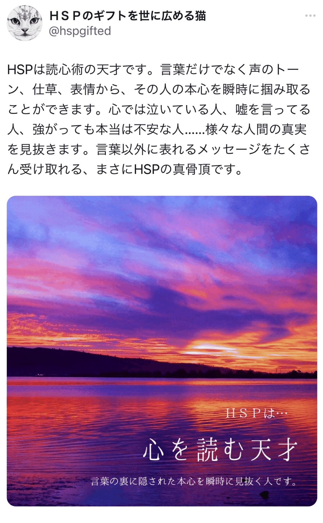 私自身は(想像力の強さ、他者の気持ちを鋭く察知する、勘が働く、芸術や音楽に深い喜びを得て興奮する、繊細な違いを感知し堪能できる、表現方法に細かくこだわるなど)HSPのポジティブな面から自身をHSPだと確信した人間なのでそれが残念でなりません。